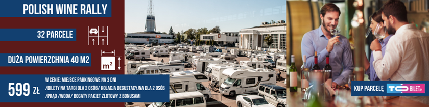 Targi WINO 2021 to w tym roku również zlot caravaningowy Polish Wine Rally, czyli I Zlot Polskiej Grupy Caravaningowej, na którym tradycyjne spotkanie ekip kamperowych zostanie uzupełnione o wyjątkową kolacje z komentowaną degustacją win z polskich winnic. Na uczestników czekają 32 duże parcele o powierzchni 40 m2 oraz bogaty pakiet zlotowy.