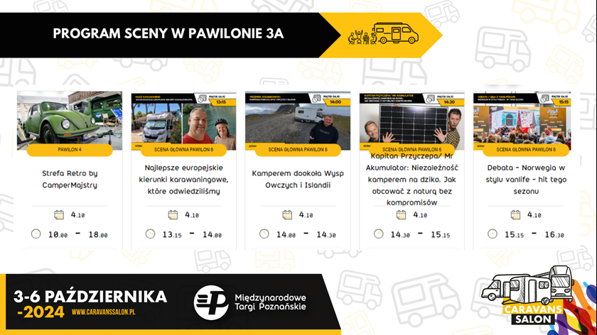 Scena główna w pełni wystartuje drugiego dnia targów, czyli w piątek 4 października i potrwa do niedzieli 6 października. Pojawią się tematy, które kompleksowo traktują o caravaningu i vanlifie. Jednymi z popularniejszych bez wątpienia są te dotyczące kierunków podróży. W tym roku będzie można posłuchać o takich miejscach jak Nepal i Afganistan, a opowiedzą o tym Sandra i Mario z Pcham do przodu; Turcja Wschodnia we wspomnieniach Moniki i Pawła z Terasfery czy Norwegia gdzie kilku podróżniczych ekip wspólnie porozmawiają o tym co ich ciągnie do tego kraju.
