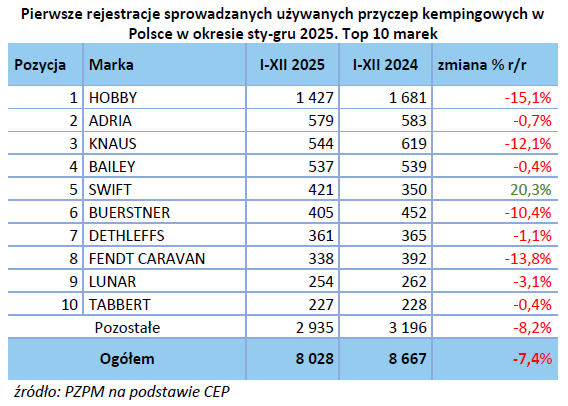 Jakub Faryś, prezes Polskiego Związku Przemysłu Motoryzacyjnego mówi: „Rok 2025 możemy zaliczyć do udanych. Jeśli chodzi o cały rynek, zanotowaliśmy lekki, niespełna dwuprocentowy wzrost liczby wszystkich pojazdów kempingowych (zarówno nowych, jak i używanych) i jest to kolejny rok wzrostów. Zarówno nowe samochody kempingowe, jak i nowe przyczepy zanotowały wzrost o ok. 3%, natomiast używanych samochodów sprowadziliśmy o ponad 25% więcej. Ponad siedmioprocentowy spadek odnotowaliśmy w przypadku używanych przyczep kempingowych. W sumie w 2025 roku na polski rynek trafiły 14 962 pojazdy kempingowe i wydaje się, że ta tendencja zostanie utrzymana. Klienci zaakceptowali tę formę turystyki, możemy więc patrzeć w przyszłość optymistycznie”.