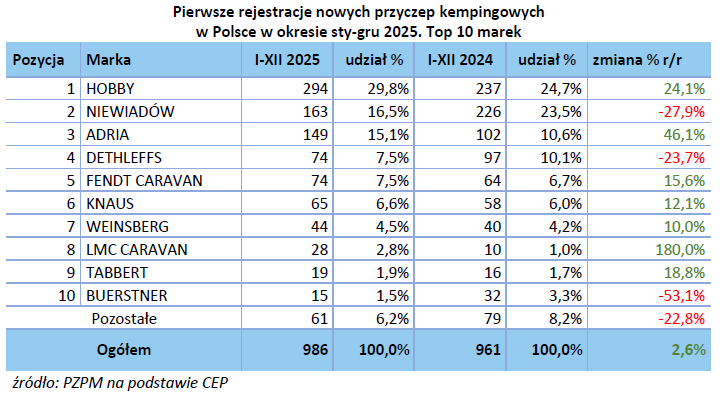 W kategorii nowych przyczep kempingowych zarejestrowano w 2025 roku – 986 szt. co jest wynikiem lepszym r/r o 27 szt. czyli 2,6 %.