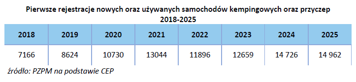 Polski Związek Przemysłu Motoryzacyjnego oraz Polska Grupa Caravaningowa przedstawiają raport rejestracji nowych i używanych kamperów oraz przyczep kempingowych w 2025 roku opracowany na podstawie danych z Centralnej Ewidencji Pojazdów.