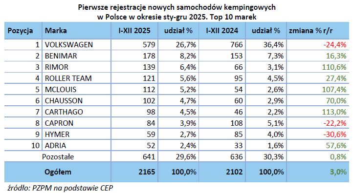 Co prawda omawiany okres nie przyniósł wielkich przetasowań na podium, jednak kilka firm zanotowało wyraźnie zauważalne wzrosty. Wśród liderów wzrostów w kategorii kamperów znalazły się: Carthago (+113%), Rimor (+110%), McLuis (+107%)  i Chausson (+70%), a w kategorii przyczep - Adria (+46%). Można zatem śmiało powiedzieć, że był to rok grupy Trigano. Zapewne pozostali gracze wyciągną z tego notowania wnioski i na rok 2026 wprowadzą wiele zmian w swoich ofertach.