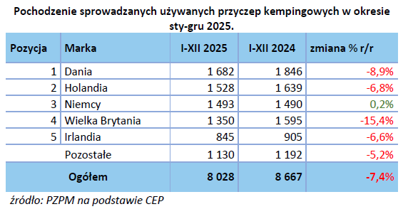 W krajach pochodzenia sprowadzonych używanych przyczep kempingowych pierwsze miejsce utrzymała Dania (1 682 szt.), na drugim miejscu Holandia (1 528 szt.) oraz podium zamykają Niemcy (1 493 szt.).