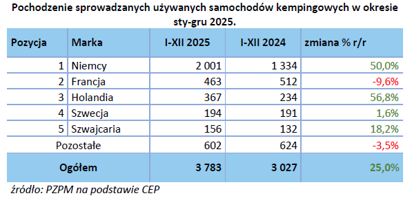 W kategorii używanych samochodów kempingowych zarejestrowano w 2025 roku o 25,0% więcej pojazdów (+ 756 szt.), kończąc rok z wynikiem 3 783 szt.