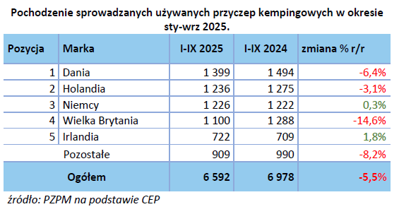 W krajach pochodzenia sprowadzonych używanych przyczep kempingowych na pierwszych trzech miejscach znalazły się Dania (1 399 szt.), na drugim Holandia (1 236 szt.) oraz Niemcy (1 226 szt.).