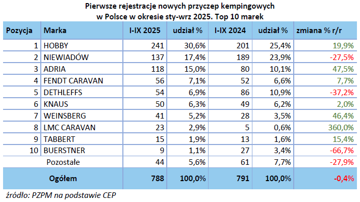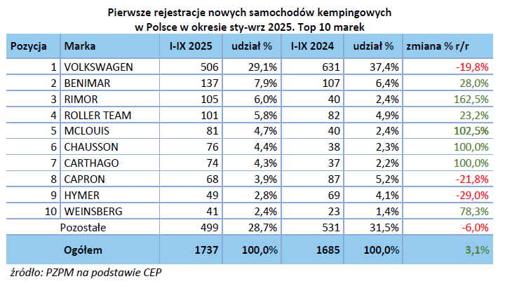 Jakub Faryś, prezes Polskiego Związku Przemysłu Motoryzacyjnego mówi: „Wyniki pierwszych dziewięciu miesięcy 2025 roku napawają optymizmem, bo wzrost rejestracji w przypadku nowych pojazdów kempingowych wyniósł ponad 3%, co – biorąc pod uwagę wcześniejsze dane, możemy potraktować jako trend rosnący.