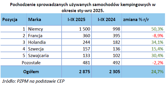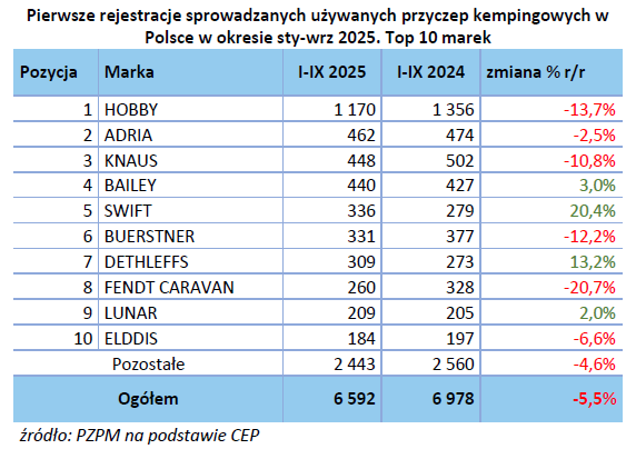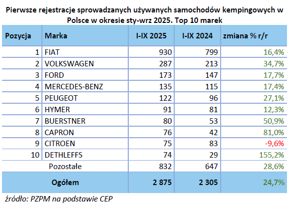 W okresie od stycznia do września 2025 roku zarejestrowano po raz pierwszy w naszym kraju 2 875 używane samochody kempingowe. Daje to wzrost dynamiki na poziomie 24,7 % (+ 570 szt.).