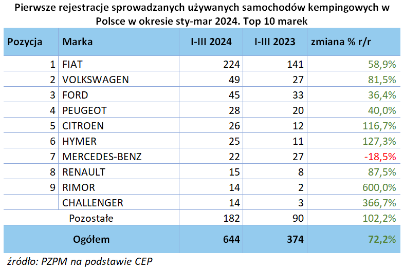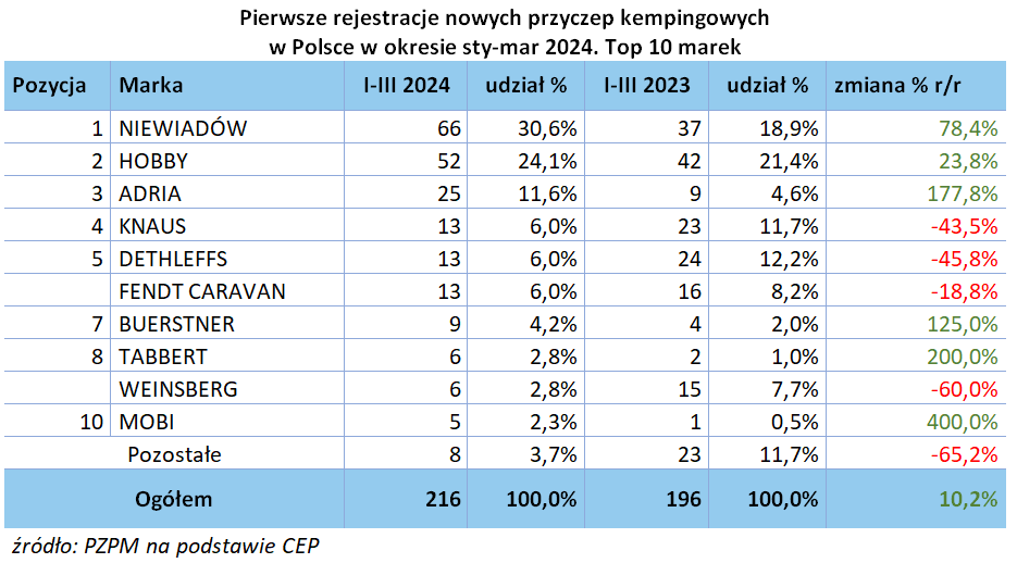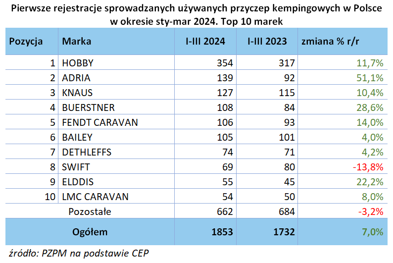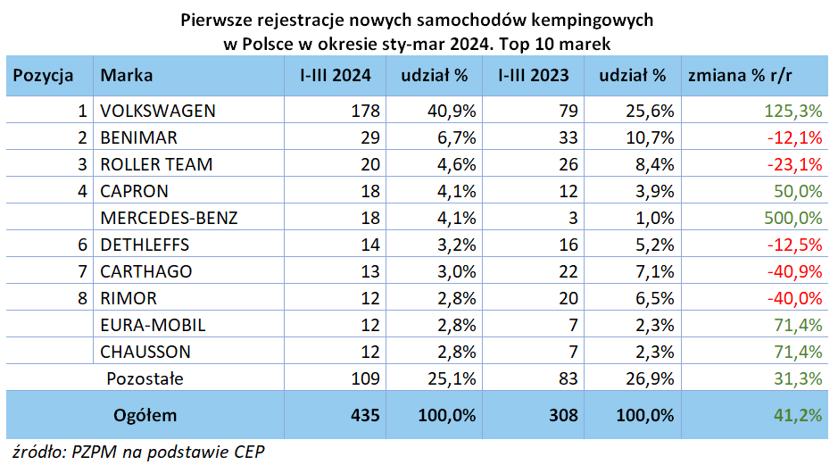 Jakub Faryś, prezes Polskiego Związku Przemysłu Motoryzacyjnego mówi: „Z wielką radością odnotowaliśmy, że 1Q 2024 roku – po nie najlepszych wynikach ostatnich kilku kwartałów – okazał się być dla większości marek bardzo dobry. Pierwsze rejestracje nowych pojazdów kempingowych wzrosły o ponad 40%, używanych – o ponad 70%, natomiast nowych przyczep o 10%, a używanych