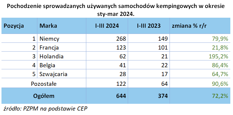Pod kątem krajów pochodzenia w przypadku sprowadzanych samochodów kempingowych prym wiodą bez zmian Niemcy (268 szt.) oraz Francja (123 szt.). Na trzecim i czwartym miejscu znalazły się Holandia (62 szt.) oraz Belgia (41 szt.).