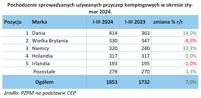 Na rynku sprowadzanych z zagranicy przyczep kempingowych w okresie od stycznia do marca 2024 r. zarejestrowano 7% więcej egzemplarzy (+ 121 szt.) r/r.