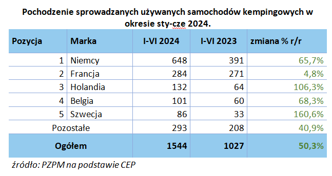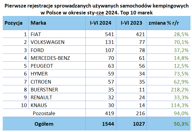 W pierwszym półroczu 2024 roku zarejestrowano po raz pierwszy w naszym kraju 1 544 szt. używanych samochodów kempingowych. Daje to wzrost dynamiki na poziomie 50,3 % (+ 517 szt.).