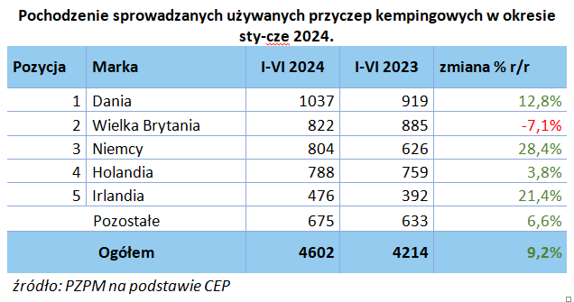 W krajach pochodzenia sprowadzonych używanych przyczep kempingowych na pierwszym miejscu utrzymała się Dania (1037 szt.), na drugim Wielka Brytania (822 szt.), a na ostatnim stopniu podium Niemcy (804 szt.).