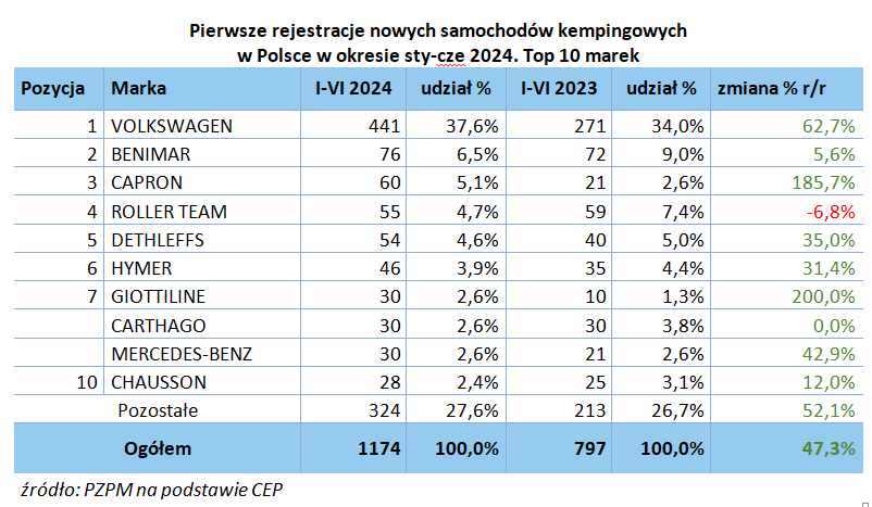 Jakub Faryś, prezes Polskiego Związku Przemysłu Motoryzacyjnego mówi: „Patrząc na wyniki rejestracji nowych samochodów kempingowych w pierwszym półroczu 2024, można z zadowoleniem stwierdzić, że wzrost jest imponujący, bo blisko 50%. Nieco gorszy, ale wciąż satysfakcjonujący - ponad 10% wynik zanotowały przyczepy kempingowe. Z bardzo podobnymi wynikami mamy do czynienia