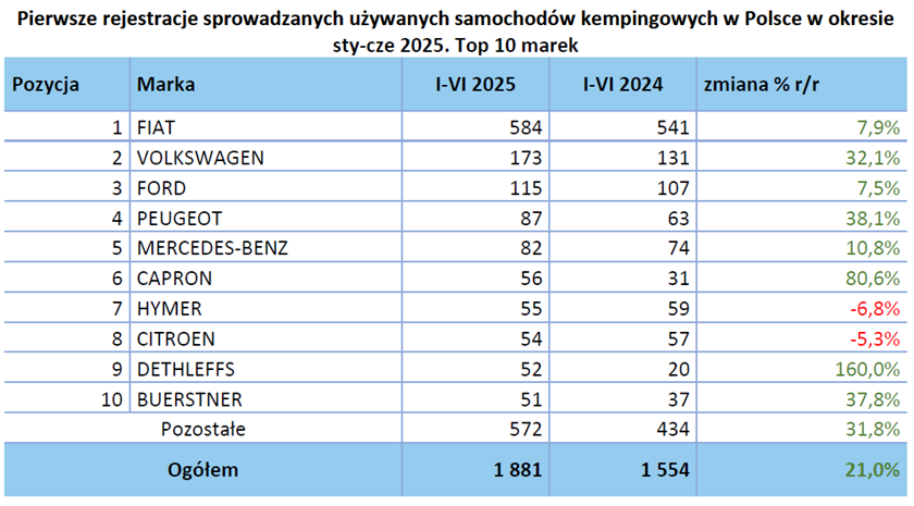 W pierwszym półroczu 2024 roku zarejestrowano po raz pierwszy w naszym kraju 1 881 szt. używanych samochodów kempingowych. Daje to wzrost na poziomie 21,0 % (+ 327 szt.).