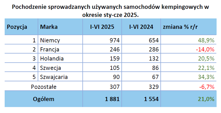 Pod kątem krajów pochodzenia w przypadku sprowadzanych samochodów kempingowych prym wiodą nieprzerwanie Niemcy (974 szt.) oraz Francja (246 szt.). Na trzecim i czwartym miejscu znalazły się Holandia (159 szt.) oraz Szwecja (105 szt.).