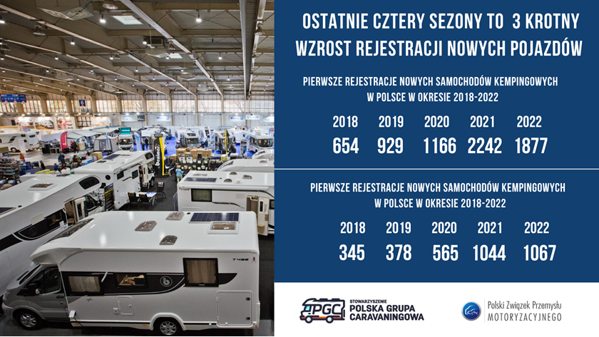 Wartymi uwagi są statystyki rejestracji w ostatnich pięciu latach, z których wynika iż w kategorii nowych samochodów kempingowych oraz nowych przyczep kempingowych odnotowaliśmy trzykrotny wzrost pomiędzy 2022 a 2018 rokiem - samochody kempingowe - 1 877 szt.